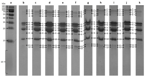 SDS-PAGE patterns of bovine milk, depending on the storing duration; each subsequent lane belongs to a different day of sampling. Marker proteins are shown in lane a. Therefore, lane b–k are assigned day 1 to day 10. The bands in each lane are numbered from 1–12.