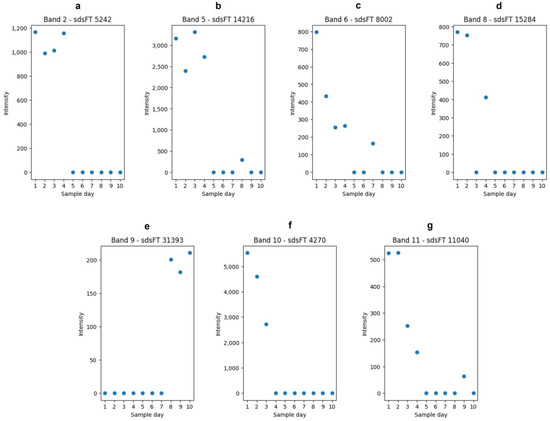 Features selected from the in-gel hydrolysis. Shown are the intensities of the features over the duration of the study. (a): Feature “sdsFT 5242” from band No. 2 (m/z: 242.2844; rt[s]: 654.3949; charge: (1). (b): Feature “sdsFT 14216” from band No. 5 (m/z: 195.1814; rt[s]: 580.5420; charge: (1). (c): Feature “sdsFT 8002” from band No. 6 (m/z: 518.2820; rt[s]: 803.4882; charge: (2). (d): Feature “sdsFT 15284” from band No. 8 (m/z: 307.0663; rt[s]: 751.2207; charge: 1). (e): Feature “sdsFT 31393” from band No. 9 (m/z: 292.8672; rt[s]: 78.3501; charge: (2). (f): Feature “sdsFT 4270” from band No. 6 (m/z: 430.2453; rt[s]: 468.0191; charge: (1). (g): Feature “sdsFT 11040” from band No. 11 (m/z: 462.8488; rt[s]: 78.9323; charge: (1).