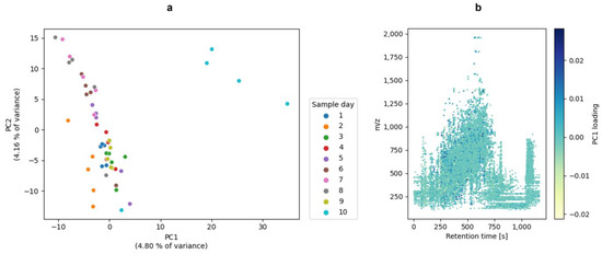 In addition to the in-gel hydrolysis, the raw milk samples were enzymatically hydrolyzed in-solution. With the extracted features from the mass spectrometric analysis of the in-solution hydrolysis, a PCA, a PLS-DA, and a PLSR were performed in order to compare these evaluation approaches and, more importantly, select features that reflect the alteration of the proteome. A PCA was applied to obtain an initial overview of the data and as an exploratory data analysis (EDA). Figure 4a visualizes the PCA as a scatter plot showing the scores of principal components 1 (PC1) and 2 (PC2). Figure 4b shows the loadings for the PC 1 features. A PCA is an unsupervised technique that clusters the data based on maximizing the variance. The PCA of the present study showed a separation of the samples. Four samples of sample day 10 were thereby separated from the other samples.