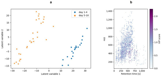 The PLS-DA of the in-solution hydrolysis raw milk samples. The used classes for the PLS-DA were “days 1–4” vs. “days 5–10”. (a): The scatter plot of the latent variables of the PLS-DA. The PLS-DA was performed after feature selection based on the VIP scores after a previous PLS-DA. (b): The plot of the features with VIP scores after feature selection. These features are also the features that were used for the PLS-DA model in (a). The plots were generated with matplotlib and seaborn.