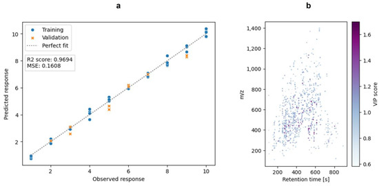 The PLSR of the milk samples (in-solution hydrolysis) over time. Raw milk samples were analyzed over a time of ten days. (a): The plot shows the observed response versus the predicted response of the training data (blue dots) and the validation data (orange crosses). (b): The plot of the features that were used to build the PLSR model. The plots were generated with matplotlib and seaborn.