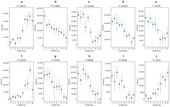 Intensities of selected features over the duration of the study. Shown are the ten features with the highest VIP score from the PLSR of the in-solution samples. The shown features are (a): FT 196375; (b): FT 113694; (c): FT 152646; (d): FT 100975; (e): FT 10104; (f): FT 221952; (g): FT 34290; (h): FT 69089; (i): FT 90590; (j): FT 53501. The plots were generated with matplotlib.
