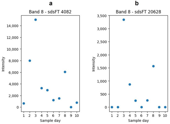The plot of the intensities of feature sdsFT 4082 (a) and sdsFT 20,628 (b). Both features were detected in the in-solution hydrolysis and in-gel hydrolysis. The plotted intensities are from the in-gel hydrolysis in the band No. 8. The plots were generated with matplotlib.