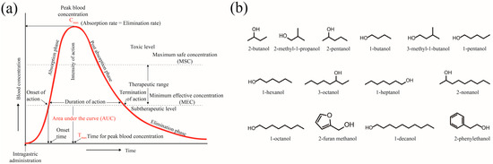 Classic blood drug concentration–time curve and chemical structure of higher alcohols. (a) Classic blood drug concentration–time curve. (b) Chemical structure of higher alcohols.