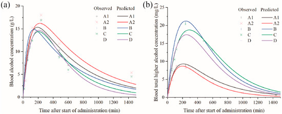 The blood concentration–time (C-T) curve can reflect the dynamic process of absorption, distribution, metabolism and excretion (ADME) of chemical components in the body [29]. Blood ethanol and higher alcohol concentrations of Bama pigs were detected within 24 h after intragastric administration of different alcoholic beverages using two pretreatment methods, HS-SPME and SPE, combined with GC-MS, respectively. Then, prediction and fitting were performed using a one-compartment PK model based on the average observed values of blood ethanol and total higher alcohols at different time points. The results are shown in Figure 2.