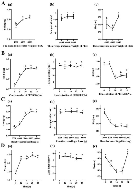 Effect of different extraction conditions on LRM-ELNs. (A) The (a) yield, (b) zeta potential, and (c) particle size of LRM-ELNs at different PEG molecular weights. Other extraction conditions: 10% of PEG6000 concentrations, 8000× g of relative centrifugal force, and 16 h of incubation time. (B) The (a) yield, (b) zeta potential, and (c) particle size of LRM-ELNs at different PEG6000 concentrations. Other extraction conditions: 16 h of incubation time and 8000× g of relative centrifugal force. (C) The (a) yield, (b) zeta potential, and (c) particle size of LRM-ELNs at different relative centrifugal forces. Other extraction conditions: 10% of PEG6000 concentrations and 16 h of incubation time. (D) The (a) yield, (b) zeta potential, and (c) particle size of LRM-ELNs at different incubation times. Other extraction conditions: 10% of PEG6000 concentrations and 8000× g of relative centrifugal force. Data are presented as the mean ± SEM. Different letters indicate a significant difference among groups (p < 0.05).