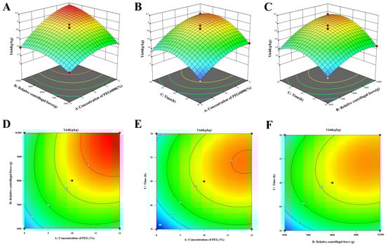 Three-dimensional (3D) response surface and the corresponding two-dimensional (2D) contour plots of the effect of the concentration of PEG6000, relative centrifugal force, and incubation time on the yield of LRM-ELNs: (A,D) concentration of PEG6000 and relative centrifugal force, (B,E) concentration of PEG6000 and time, (C,F) relative centrifugal force and time.