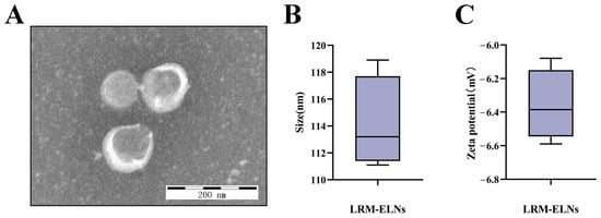 TEM was utilized to examine the morphology of LRM-ELNs isolated under optimized conditions. As depicted in Figure 3A, LRM-ELNs exhibited a spherical shape, representative of ELNs [40]. Analysis with a nanoparticle size analyzer revealed a mean particle size of 114.1 nm (Figure 3B). Additionally, the zeta potential of the LRM-ELNs was measured to be −6.36 mV (Figure 3C).
