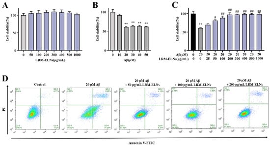 LRM-ELNs reduced Aβ-induced cytotoxicity and apoptosis in HT22 cells. The MTT assay was conducted to assess the impacts of (A) LRM-ELNs, (B) Aβ, and (C) LRM-ELNs/Aβ on the viability of HT22 cells. (D) Flow cytometry was conducted to evaluate the influence of LRM-ELNs on Aβ-induced apoptosis in HT22 cells. Data are expressed as mean ± SEM. ** p < 0.01 vs. the control group, # p < 0.05, and ## p < 0.01 vs. the Aβ group.