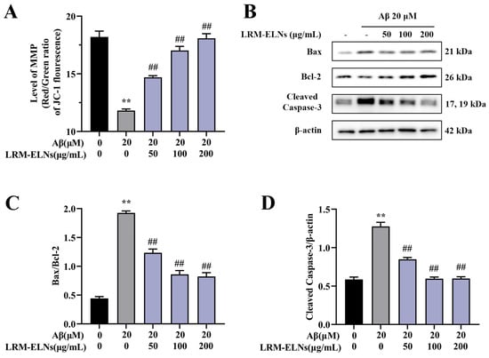 The pathology of AD shows a strong relationship between Aβ accumulation and the degree of dementia symptoms [19,20]. Mitochondria are essential for cellular respiration, metabolic process maintenance, and ion transport, significantly influencing the cell’s life cycle [50]. Research has shown that Aβ induces mitochondrial damage in neuronal cells, characterized by a decrease in mitochondrial membrane potential (MMP) [51]. This subsequently induces the expression of pro-apoptotic proteins like Bax, inhibits anti-apoptotic proteins like Bcl-2, and activates Cleaved Caspase-3, leading to apoptosis [46]. Our results showed that Aβ stimulation decreased MMP while increasing the Bax/Bcl-2 protein ratio and Cleaved Caspase-3 expression in HT22 cells. However, LRM-ELNs upregulated MMP, decreased the Bax/Bcl-2 ratio, and downregulated Cleaved Caspase-3 expression (Figure 5). Additionally, LRM-ELNs protected HT22 cells from Aβ-induced cytotoxicity (Figure 4C) and inhibited Aβ-induced apoptosis (Figure 4D). These findings suggest that LRM-ELNs protect HT22 cells from Aβ-induced apoptosis through the mitochondrial apoptotic pathway.