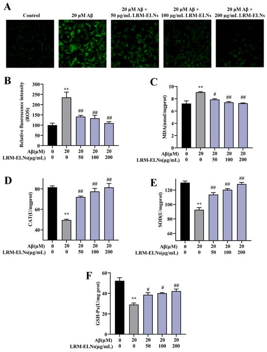Effects of LRM-ELNs on antioxidant indices in HT22 cells. Levels of (A,B) ROS, (C) MDA, (D) CAT, (E) SOD, and (F) GSH-Px in HT22 cells treated with Aβ, with or without different concentrations of LRM-ELNs. Data are expressed as mean ± SEM. ** p < 0.01 vs. the control group, # p < 0.05, ## p < 0.01 vs. the Aβ group.