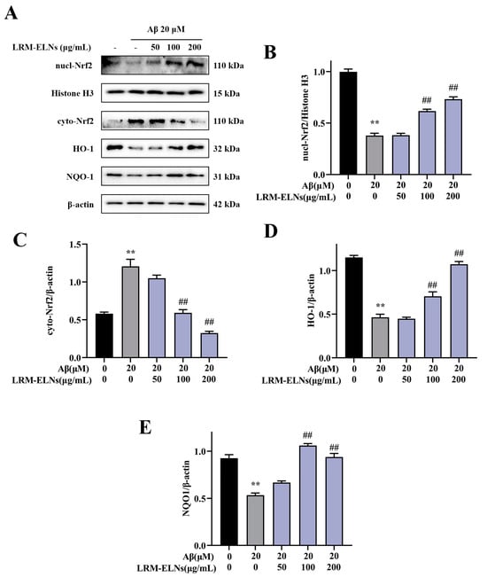 Effects of LRM-ELNs on the Nrf2/HO-1/NQO1 signaling pathway in HT22 cells induced by Aβ. (A–E) The protein levels of nucl-Nrf2, cyto-Nrf2, HO-1, and NQO1 in HT22 cells were determined by WB. Data are expressed as mean ± SEM. ** p < 0.01 vs. the control group, ## p < 0.01 vs. the Aβ group.