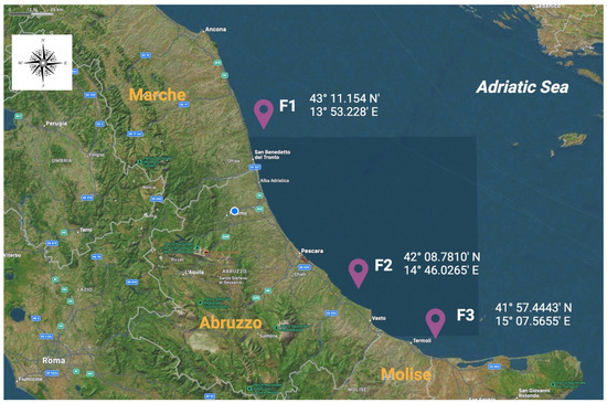Geographical distributions and their respective georeferentiations of the screened mariculture farms involved in the present biomolecular investigation. F1: farm 1, located in the Marche region; F2: farm 2, located in the Abruzzo region; F3: farm 3, located in the Molise region.