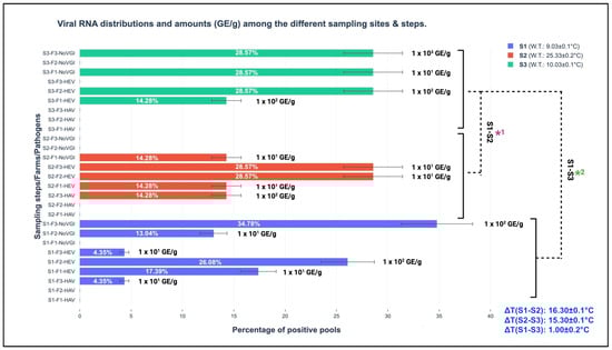 From a quantitative perspective, NoV GI saw higher amounts in S3 (winter season), with a value of 1.0 × 103 GE/g, and an absence of RNA in S2 (summer); 102 GE/g was observed in S1 in the same farm (F3). A schematic illustration of the GE/g distributions among the farm sites, pathogens, and seasons is provided in Figure 2. The observed seasonal NoV behavior confirms the scientific hypothesis about the importance of water temperature variability for viral loads. Indeed, consistent water thermal changes such as ∆T (S1–S2): 16.30 ± 0.1 °C and ∆T (S2–S3): 15.30 ± 0.1 °C were observed in two specific moments between the warm and cold seasons. The results obtained from the one-step RT-qPCR assays support and confirm that low temperatures (between January and March in Mediterranean Europe) provide favorable environmental conditions for NoV survival and environmental persistence, with this also conserving its infectivity with special regard to naked viruses or quasi-enveloped versions, as suggested by Choi and Kingsley [36].