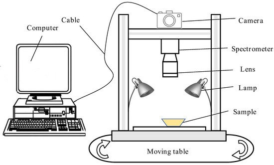 The hyperspectral imaging system used in this study is shown in Figure 1. The system was mainly composed of a mobile workbench (moving samples), four 150 W tungsten light sources (providing a bright environment), a 270 × 310 pixel camera (shooting samples), and a computer and a monitor (for collecting and recording information). After focusing, the shooting parameters of the hyperspectral imaging system were as follows: object distance of 400 mm, light source steady flow of 5.0 A, scanning speed of 150 μm/s, line scanning length of 70 mm, exposure time of the imaging spectrometer of 25 ms, and a spectral resolution of the finally obtained spectral image of 300 pix × 310 pix × 248 pix.
