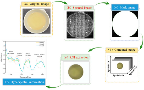 The hyperspectral data collection process for camellia seed oil involved pouring 10 ± 0.05 g of the sample into a 30 mL ceramic evaporating dish. The dish was then placed flat on a moving table and moved at a speed of 25 mm/s. The Spec View software (SpecVIEW v2.9) was used to conduct hyperspectral data acquisition and reflectivity calibration. Six samples were scanned per picture, with each group scanned three times, and the average value was taken for analysis. The process of spectral information extraction is shown in Figure 2. According to the previous studies, the ENVI spectral image processing software was applied to process the collected images, including cropping, background segmentation, and region of interest (ROI) extraction. When extracting the ROI, the camellia seed oil region in each image should be selected and cropped, and the average spectral reflectance of the ROI calculated to serve as the sample’s spectral data.