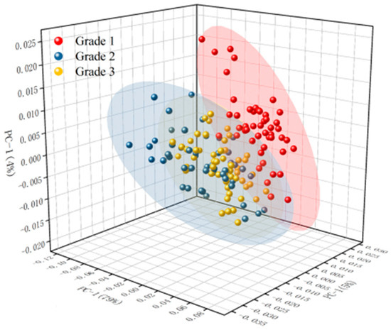 The grade classification results of the PCA are shown in Figure 4 and Figure S3. It could be seen from Figure S3a that there was some data clustering in the original spectrum; however, three different grades of camellia oil were cross-mixed together, and the classification characteristics of the original spectrum were not significant. It could be seen from Figure S3b,d,e that the classification effect of the model after SG, 1Der, and 2Der preprocessing was worse than that of the original spectrum, possibly due to the removal of some effective information in the spectrum during preprocessing. It could be seen from Figure 4 and Figure S3c that the model’s classification performance improved after normalization and SNV preprocessing compared to the original spectrum, and the three grades of camellia seed oil could be distinguished basically. Among them, the classification effect of the PCA after SNV preprocessing was optimal. The separability of Grade 1 and Grade 3 samples was obvious, and there was a small amount of cross-mixed samples between the Grade 2 samples and the Grade 1 or Grade 3 samples. A similar conclusion was obtained in the origin identification of dried tangerine peel by near infrared spectroscopy. The identification accuracy of dried tangerine peel origin was 88.60% after SNV preprocessing and a principal component analysis [28]. This finding suggested that SNV preprocessing is an effective method for classification research. For the grade classification of camellia seed oil, the results of PCA after SNV preprocessing showed that there was still a small amount of cross-mixed samples between Grade 2 and Grade 1 or Grade 3 camellia seed oil. It was necessary to continue to optimize the modeling.