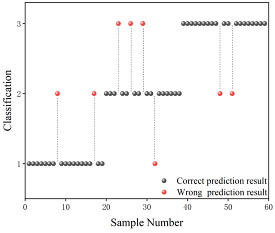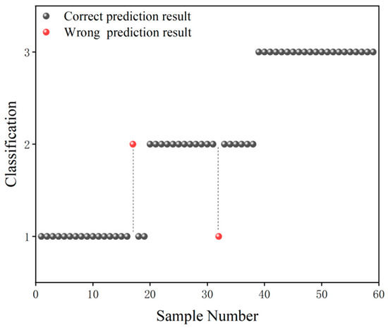 The grade classification prediction result of the CARS-GA-SVM model is shown in Figure 5, in which the black ball indicates the correct prediction result and the red ball indicates the wrong prediction result. As can be seen from Figure 5, in terms of Grade 1 samples, only two Grade 1 samples were misclassified as Grade 2 samples. In terms of Grade 2 samples, only one Grade 2 sample was misclassified as a Grade 1 sample, and three Grade 2 samples were misclassified as Grade 3 samples. In terms of Grade 3 samples, only two were misclassified as Grade 2 samples. In general, the grade classification prediction ability of the CARS-GA-SVM model was high.