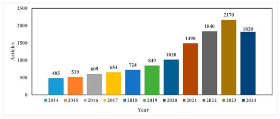 As can be seen from Figure 2, this search yielded a total of 9302 documents for “detection of mycotoxin in food using machine learning techniques”. Most articles were published in the period of 2020–2024. The search identified 742 articles published in 2020, and an increase of 1.48% was observed in 2021. Year after year, a rise in published studies was observed. Up until 10 September 2024, 1580 articles had been published, indicating that the use of ML algorithms for the detection of mycotoxin in food has been growing rapidly in recent years. Similar trends were also observed for deep learning techniques (Figure 3).