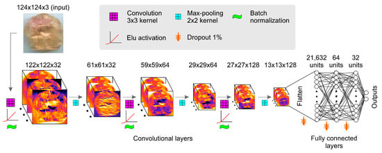 Hyperparameter tuning is first conducted using a random search method, followed by the development of a custom network architecture. To illustrate how the input is transformed to extract features, the convolutional layers are shown with their intermediate activations, representing the outputs of the convolutional network. The dimensions of each step are indicated by the numbers displayed above the layers. Reprinted from [59]. Copyright © 2024 by the authors and Agriculture, MDPI Publishers.