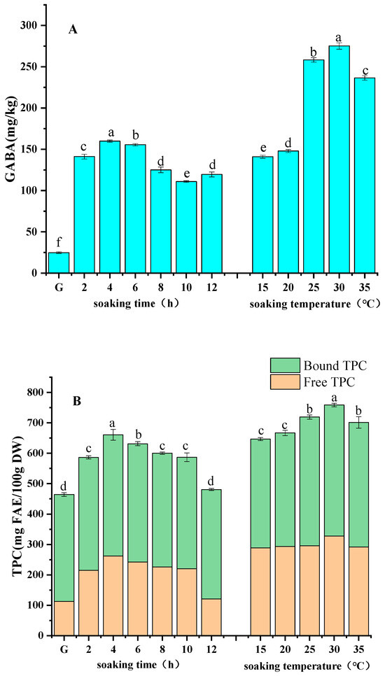 Effects of soaking conditions (soaking time and temperature) on the GABA content (A) and TPC (B) of germinated foxtail millets. G: ungerminated foxtail millet seeds. Different lowercases in the same histogram indicate statistically significant differences (p < 0.05).