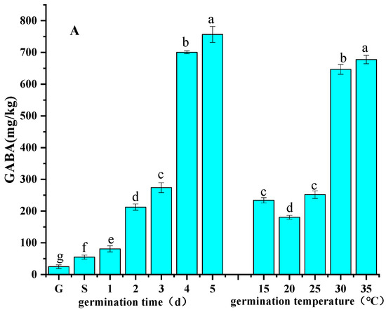 The effects of germination temperature on the GABA and TPC of foxtail millets are shown in Figure 2A,B. The GABA level and TPC of foxtail millet sprouts increased with increasing temperature in the selected experimental temperature range under the conditions of soaking at 30 °C for 4 h, reaching 677.56 mg/kg and 919.07 mg FAE/100 g DW, respectively, at a germination temperature of 35 °C. This performance was attributed to the increase in activities of GAD and PAL with the increasing germination temperature, which provided the basis for the accumulations of GABA and phenolics. In addition, the increase in germination temperature within the appropriate range affected the germination cycle of foxtail millet grain, with significant differences in the accumulation of GABA and phenolics as germination cycle changed [10].