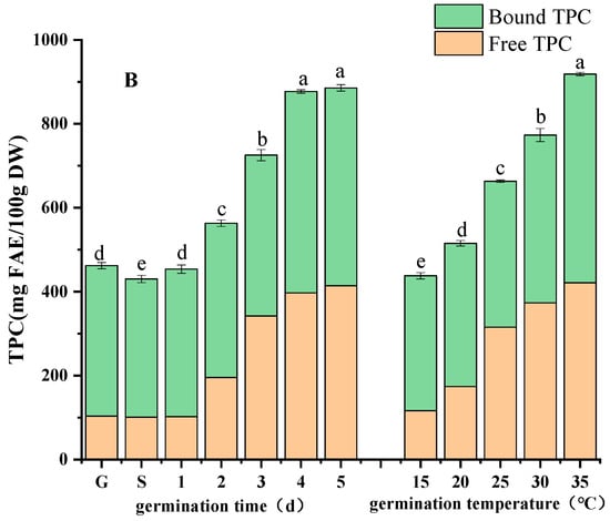 Effects of germination conditions (germination time and temperature) on the GABA content (A) and TPC (B) of germinated foxtail millets. G: ungerminated foxtail millet seeds, S: presoaked foxtail millet seeds. Different lowercases in the same histogram indicate statistically significant differences (p < 0.05).