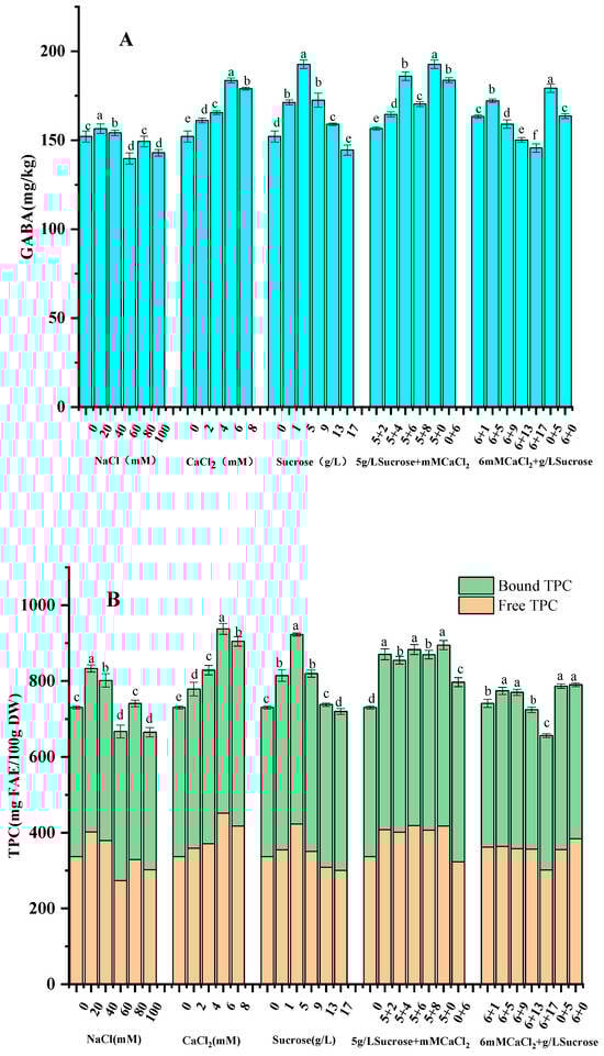 After being soaked in pure water at 30 °C for 4 h, different culture solutions—NaCl concentration: 0 mM, 20 mM, 40 mM, 60 mM, 80 mM, and 100 mM; CaCl2 concentration: 0 mM, 2 mM, 4 mM, 6 mM, and 8 mM; sucrose concentration: 0 g/L, 1 g/L, 5 g/L, 9 g/L, 13 g/L, and 17 g/L; 5 g/L sucrose + CaCl2: 0 mM CaCl2, 2 mM CaCl2, 4 mM CaCl2, 6 mM CaCl2, and 8 mM CaCl2, and 6 mM CaCl2+ sucrose: 1 g/L sucrose, 5 g/L sucrose, 9 g/L sucrose, 13 g/L sucrose, and 17 g/L sucrose—were used to maintain 90% humidity, independently. Following, TPC and GABA content of foxtail millet sprouts were measured.