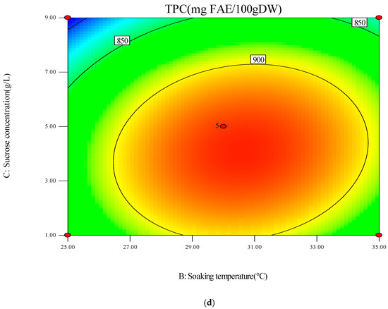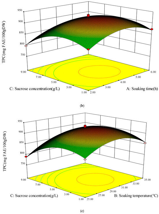 The interaction between soaking time and soaking temperature is shown in Figure 4a, and interaction between soaking time and sucrose concentration is displayed in Figure 4b; both of them had no significant effect (p > 0.05) on the TPC of foxtail millet sprouts. As shown in Figure 4c,d, a highly significant interaction (p < 0.05) between soaking temperature and sucrose concentration on TPC was achieved, showing a tendency of first increasing and then decreasing when the soaking temperature was varied at the constant sucrose concentration. On the other side, the TPC of foxtail millet sprouts showed an initial increase and then decreasing trend with increasing sucrose concentration at the constant soaking temperature. When the soaking time was constant, the soaking temperature was 30 °C, and the sucrose concentration was 5 g/L as the highest point of the response surface; the phenolic enrichment of foxtail millet sprouts reached the maximum of 935.93 mg FAE/100 g DW, and the further increase of these two factors would negatively affect the TPC [16].