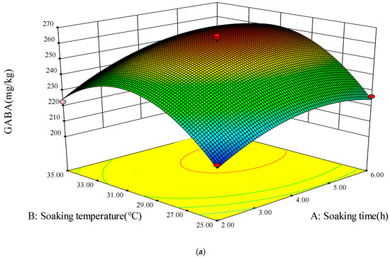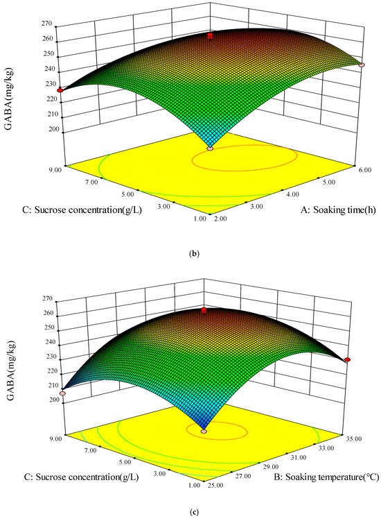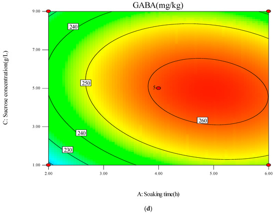 The interaction between soaking time and soaking temperature is shown in Figure 5a, and interaction between soaking temperature and sucrose concentration is displayed in Figure 5c; both of them had no significant effect (p > 0.05) on the GABA enrichment of foxtail millet sprouts. A significant (p < 0.05) interaction between soaking time and sucrose concentration was achieved and is exhibited in Figure 5b,d. The GABA content of foxtail millet sprouts increased with the increasing soaking time and sucrose concentration, reaching the maximum value and then starting to decrease, suggesting that too long of a soaking time and excessive sucrose concentration could negatively affect the enrichment of GABA in foxtail millet sprouts [5,40].