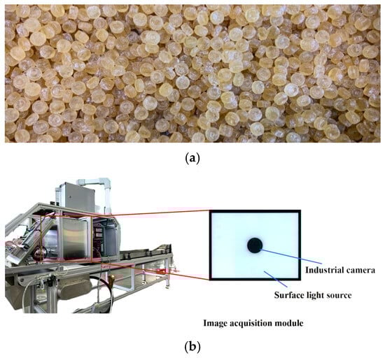 The data used in this paper were obtained from Nantong Wealth Machinery Technical Co., Ltd., located in Nantong, Jiangsu, China. This company specializes in the design and manufacture of various types of confectionery production and packaging equipment. The candy surface images obtained in this paper were captured by an area scan industrial camera installed above the candy sorting equipment. This camera captures images with the size of 2376 × 584 pixels, utilizing a pixel matrix for exposure at a rate of 10 frames per second. The captured image data are transmitted to a vision workstation, where candy defect detection and recognition algorithms are executed. The candies used in this paper were light brown, semi-transparent, round hard candies produced by the company, with a diameter of 1.2 cm and a weight of 2 g per piece. Due to limitations in the candy production line, the color of the candy images captured by the industrial camera may vary. Therefore, the defect detection model in this study focused exclusively on shape defects. According to the company’s production standards, a candy is classified as defective if the top-view area deviates from the standard by more than 10%, and defective candies must be detected and subsequently removed during the production process. Shape defects, such as bulging, indentation, and breakage, are present in the candies, often exhibiting subtle features and a wide range of variations, which pose significant challenges for accurate detection and recognition. Considering the imbalance between defective and complete candy samples in the industrial production processes, it is necessary to increase the quantity and defect types of defective candy samples to enhance the performance of the candy defect detection algorithm based on the target detection network. The candy sorting equipment and some defective candy samples are shown in Figure 1.