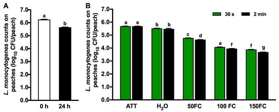 Efficacy of chlorine against Listeria monocytogenes on peaches with 30 s or 2 min contact. (A) L. monocytogenes counts on peaches immediately after inoculation (0 h) and 24 h post-inoculation (24 h). (B) L. monocytogenes recovered on peaches after 30 s or 2 min contact in the respective wash solution. ATT: peaches 24 h post-inoculation. H2O: peaches washed with tap water. FC: free chlorine. 50 FC, 100 FC, or 150 FC: peaches washed with chlorine solution at 50 mg/L FC, 100 mg/L FC, or 150 mg/L FC. Mean ± SEM averaged from three independent studies with 10 peaches/treatment in each independent study. Histogram bars without common letters differ significantly (p < 0.05).