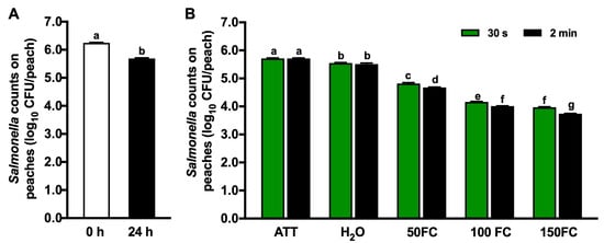 Efficacy of chlorine against Salmonella on peaches with 30 s or 2 min contact. (A) Salmonella counts on peaches immediately after inoculation (0 h) and 24 h post-inoculation (24 h). (B) Salmonella counts recovered on peaches after 30 s or 2 min contact. ATT: peaches 24 h post-inoculation. H2O: peaches washed with tap water. FC: free chlorine. 50 FC, 100 FC, or 150 FC: peaches washed with chlorine solution at 50 mg/L FC, 100 mg/L FC, or 150 mg/L FC. Mean ± SEM averaged from three independent studies with 10 peaches/treatment in each independent study. Histogram bars without common letters differ significantly (p < 0.05).