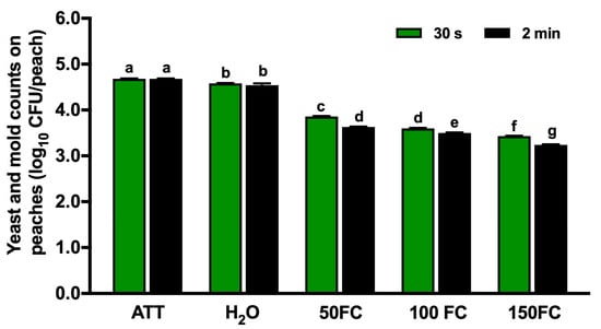 The native yeast and mold count on peaches was 4.68 log10 CFU/peach. A tap water wash of up to 2 min had a limited ability to remove yeasts and molds, achieving only a ~0.1 log10 CFU/peach reduction (Figure 3). The application of chlorine and the extension of the contact time at the respective chlorine concentrations improved (p < 0.05) the removal of yeasts and molds. Exposure to 50, 100, and 150 mg/L of FC for 30 s to 2 min reduced yeasts and molds by 0.81–1.05, 1.07–1.17, and 1.24–1.43 log10 CFU/peach, respectively (Figure 3).
