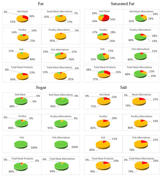 High sugar content was observed in only 5% of the meat products and none of the PB products. Interestingly, 19% of meat and PB products contained high salt levels.