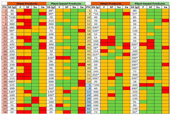 The FoP TL information for individual product against its PB counterpart within each sub-category is presented in Figure 2, along with the serving size for each product (please see Appendix A for further details). FoP TL information was unavailable for 14 of the meat products and 15 of the PB alternatives; therefore, it was calculated using the 2016 UK Food Standards Agency’s guide on creating FoP nutrition labels for pre-packed foods sold via retail outlets [20].