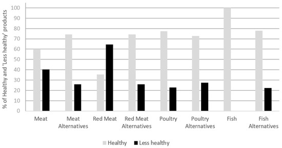 Categorisation of products as ‘Healthy’ and ‘Less healthy’ by nutrient profiling (p values for meat, red meat, poultry and fish categories are p < 0.086, p < 0.005, p < 0.728 and p < 0.471, respectively).