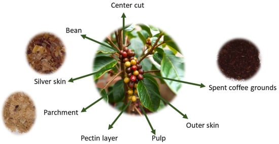 Among these waste and by-products, spent coffee grounds are the most abundantly generated during processing (650 g per kg of fresh coffee cherry), while parchment and coffee husks represent only between 35–61 g and 120–180 g per kg of fresh coffee cherry, respectively []. Given the fact that most of these residues are piled up or burned out, their accumulation could be considered an environmental hazard due to CO2 emission during burning or the pollution of the soil by the lixiviation of toxic secondary metabolites; hence, additional procedures are needed to tackle this problem in a sustainable manner [].