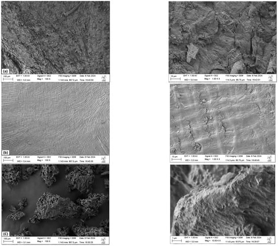 FESEM micrographies of the (a) coffee husk, (b) coffee parchment and (c) spent coffee grounds. On the left side, images of the three residues with a magnification of 100 μm are shown, whereas on the right side, images at the scale of 10 and 1 μm can be seen.