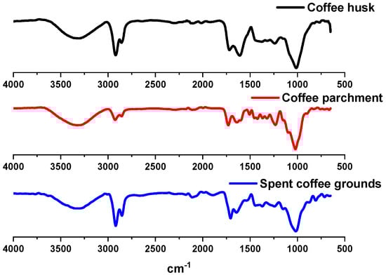 Table S1 of the Supplementary Material shows the assignments of the most intense signals and the compounds that may be associated; for this, we were guided by what was stated by Toribio-Cuaya et al. []. In all the spectra, intense signals associated with ν-OH, νCsp3−H, νC=O, νC=C, γ CH (ring deformation) and Si–O–Si (asymmetric stretching) can be seen, demonstrating the abundance of these groups in these wastes. In the case of the signal at 1236.07 cm−3 from the coffee parchment, it is more intense in relation to those of the other residues; this may be related to a greater abundance of syringyl alcohols in the lignin [].