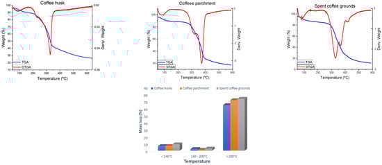 Figure 5 (Table 4) shows the thermo-gravimetric weight loss curve (TGA) and the differential curve (DTGA) corresponding to the three lignocellulosic wastes. Table 4 shows mass losses (%) in the TGA of coffee residues. The first zone is below 200 °C, the second zone between 200 and 400 °C, and the third zone above 400 °C. In the first zone, the release of adsorbed moisture and other volatile compounds takes place. All three wastes show a peak below 150 °C with a mass loss between 6% for coffee husk and 9% for spent coffee grounds.