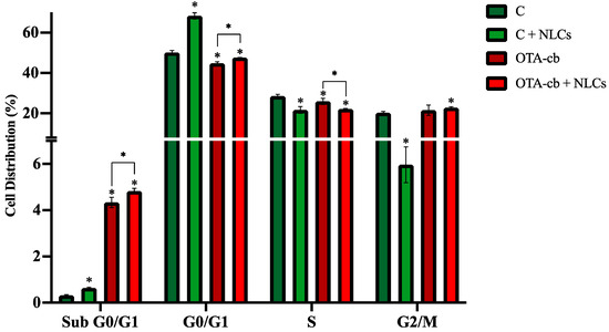 Bread intestinal digest’s (0.330 ± 0.004 µM OTA) effect on Jurkat cell-cycle phases (sub-G0/G1, -G0/G1, -S, and -G2/M). Data are expressed as the means ± SD (n = 4), and significative differences are indicated at p < 0.05 (*). Significant differences between the C digest and C + NLCs, OTA-cb, and OTA-cb + NLCs are denoted by asterisks directly above the columns. Significative differences between OTA-cb and OTA-cb + NLCs are indicated by asterisks above the brackets. NLCs, nanostructured lipid carriers; OTA, ochratoxin A; OTA-cb, ochratoxin-A-contaminated bread.