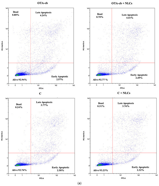 As regard the results of the apoptosis/necrosis pathway’s evaluation, significant increases in the percentage of death cells were recorded for the OTA-cb (p < 0.001) and OTA-cb + NLCs (p < 0.01) treatments compared to the C digest. The increases in the percentage of death cells recorded for both treatments could be related to the presence of OTA in the intestinal digest. Different studies have demonstrated that OTA exposure in different cells lines results in an increase in the amount of apoptotic and necrotic cells. Zhao et al. [30] observed significant increases in the apoptotic rate and in the number of apoptotic Het-1A cells when exposed to different concentrations of OTA (5-10 µM) for 24 h. Similar results on porcine alveolar macrophages (PAMs) were also reported by Xu et al. [31] and Gan et al. [32]. In these studies, exposure to OTA for 48 h (0.1–2 µg/mL [31] and 5–7 µM [32]) led to increases in the late apoptotic cells and apoptotic rate. The low value of apoptotic cells reported in the present work could be explained considering the lower concentrations of OTA in the intestinal digest, which, similar to the cell-cycle analysis, was not sufficient to exert a significant effect on Jurkat cells.