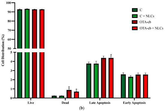 Intestinal digests’ effects (0.330 ± 0.004 μM OTA) on the apoptosis/necrosis pathway: (a) plots from the cell apoptosis assay after Jurkat exposure to intestinal digests; (b) bar graph reporting the means ± SD (n = 4). Significative differences are indicated at p < 0.05 (*). Significant differences between the C digest and C + NLCs, OTA-cb, and OTA-cb + NLCs are denoted by asterisks directly above the columns. C, control; NLCs, nanostructured lipid carriers; OTA-cb, ochratoxin-A-contaminated bread.