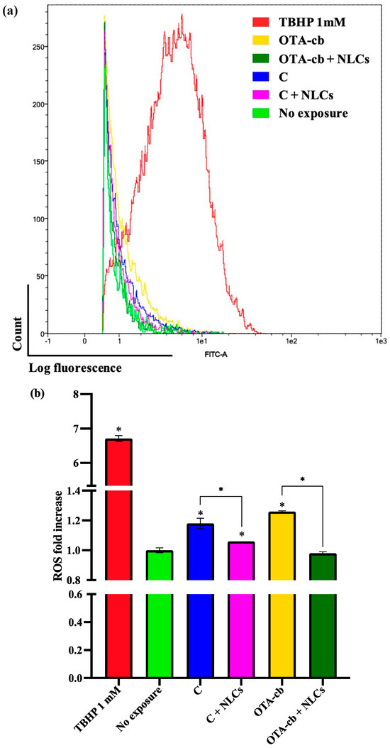 Effects of the intestinal digests (0.330 ± 0.004 μM OTA) on ROS generation: (a) representative plots of cell counts versus the LOG fluorescence of 20.000 events, analyzed using a flow cytometer for the detection of ROS; (b) bar graph reporting the intensity of the mean fluorescence ± SD (n = 4), expressed as the fold increase in the non-exposed. Significative differences are indicated for p < 0.05 (*). Significant differences between the nonexposed cells and cells exposed to the C, C + NLCs, OTA-cb, and OTA-cb + NLCs digests are denoted by asterisks directly above the columns. Significative differences for C vs. C + NLCs and OTA-cb vs. OTA-cb + NLCs are indicated by asterisks above the brackets. NLCs, nanostructured lipid carriers; OTA, ochratoxin A; OTA-cb, ochratoxin-A-contaminated bread.