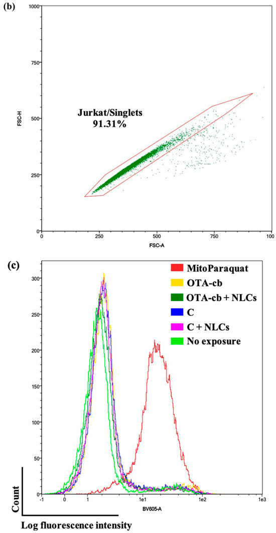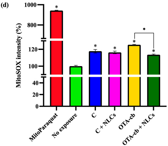 MitoSOX-based flow cytometry was employed to detect mitochondrial reactive oxygen species (ROS) in Jurkat cells following exposure to intestinal digests (0.330 ± 0.004 μM OTA). The process involved several steps to obtain the intensity of the MitoSOX fluorescence from the Jurkat singlets: (a) identification of viable Jurkat cells, based on side scatter (SSC) and forward scatter (FSC) characteristics, displayed in density plots; (b) gating of the singlet Jurkat cells based on forward scatter characteristics; (c) median intensity determination of the fluorescence of the Jurkat singlets acquired using the B4 channel after exposure; (d) bar graph reporting the mean MitoSOX intensity ± SD (n = 4). Significative differences are indicated for p < 0.05 (*). Significant differences between nonexposed cells and cell exposed to MitoParaquat, C, C + NLC, OTA-cb, and OTA-cb + NLC digest are denoted by asterisks directly above the columns. Significative differences for OTA-cb vs. OTA-cb + NLCs are indicated by asterisks above the brackets. C, control; NLCs, nanostructured lipid carriers; OTA, ochratoxin A; OTA-cb, ochratoxin-A-contaminated bread.