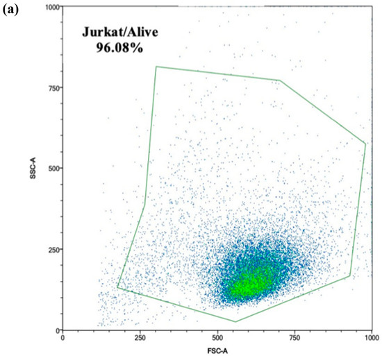 At the end of the exposure period, Jurkat cells were harvested, placed in a centrifuge tube, and subjected to centrifugation at 1400 rpm for 5 min. The cellular pellet was reconstituted with a 5 μM H2DCFDA solution, followed by a 20 min incubation at 37 °C in the dark. Subsequently, the samples underwent two PBS washes and were then analyzed using a flow cytometer. As a positive control, 1 mM tert-butyl hydroperoxide (TBHP) was employed after a 30 min incubation period.