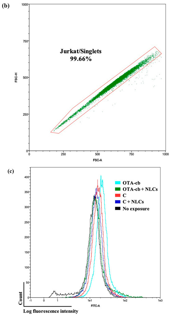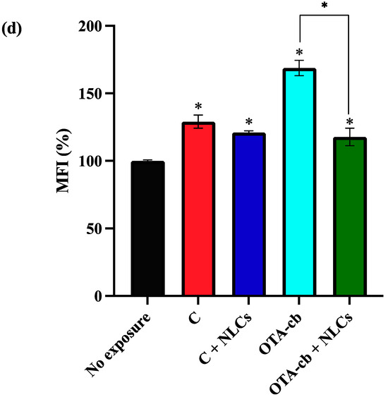 The impact of intestinal digests (0.330 ± 0.004 μM OTA) on the mitochondrial mass was evaluated. Several steps were undertaken to obtain the median fluorescence intensity (MFI) from the Jurkat singlets: (a) identification of the viable Jurkat cells based on side scatter (SSC) and forward scatter (FSC) characteristics; (b) gating of the singlet Jurkat cells using forward scatter characteristics, illustrated in density plots; (c) determination of the MFI of the Jurkat singlets obtained using the FITC channel; (d) bar graph reporting MFI ± SD (n = 4) of the MitoTracker dye following 7 days of incubation of the Jurkat cells with intestinal digests. Significative differences are indicated for p < 0.05 (*). Significant differences between the nonexposed cells and cells exposed to the C, C + NLCs, OTA-cb, and OTA-cb + NLCs digests are denoted by asterisks directly above the columns. Significative differences for OTA-cb vs. OTA-cb + NLCs are indicated by asterisks above the brackets. C, control; NLCs, nanostructured lipid carriers; OTA, ochratoxin A; OTA-cb, ochratoxin-A-contaminated bread.