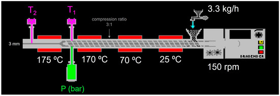 Figure 1 shows the conditions during extrusion. Screw speed, motor torque, melt pressure (P), and barrel temperatures (T1 and T2) were monitored using Extruder Winext software (Brabender).