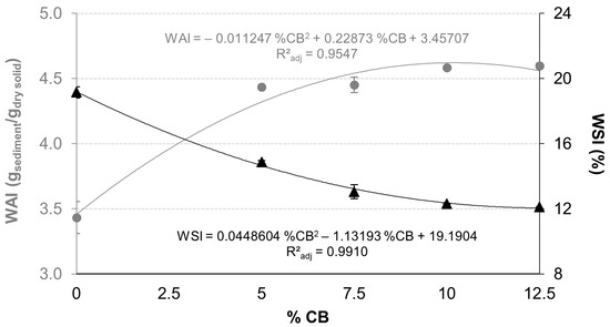 Mean values and standard deviation of water absorption index (WAI) and water solubility index (WSI) of extrudate according to carob bean (CB) %. Figure includes the significantly (p < 0.05) fitted and R2-adjusted equation.